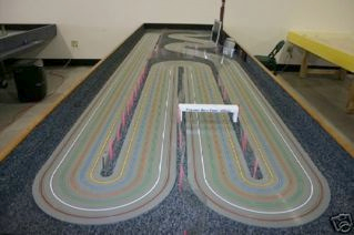 "Well this is what me and a friend had and he's moving and that's where the track was set up. We would race for $1.00 a race best out of 5. At any time if you hit the train you would lose the race and have to pay the train fund $1.00. We would use that money to buy more stuff. There are exploding box cars and if you hit one of those it was an extra $1.00. The box cars are old Lionel in great condition and I have 3 of them. Also I cut the bottom out of some train cars so you could go under them so you didn't have to wait for the whole train to go by. There is 4 or 5 passenger cars I did that to also but not in the pictures. I made the double train crossings so 2 trains could run through the car track at the same time. I also made slot car cross tracks because the factory ones had to big of a gap. The bank track in the pictures are glued together so and solder so there ain't any shorts. Also I glued plastic around the turns instead of the guard rail and that really works great."